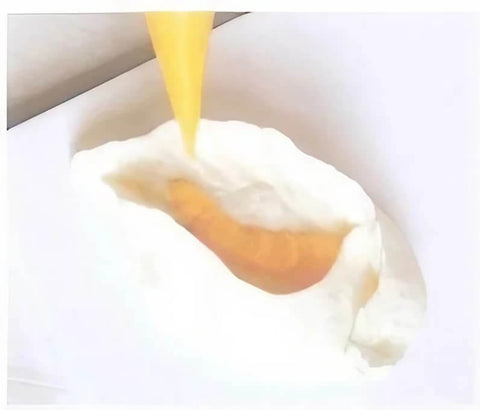 - Cut a moderate-sized hole at the end of the piping bag and, with stable pressure, pipe the yellow center. Gradually reduce the pressure while moving towards the top.
