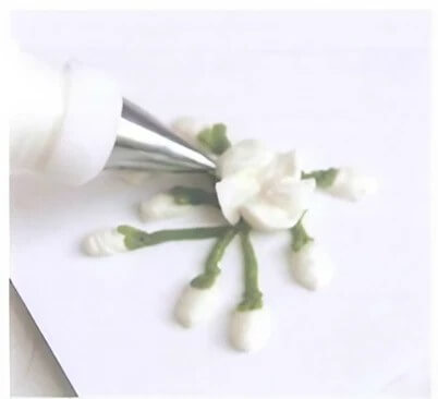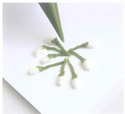 - Cut a small hole at the end of a piping bag filled with green buttercream frosting. Pipe stems and sepals around each flower bud.