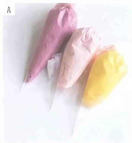 1. Наполните три отдельных кондитерских мешка сливочным кремом разного цвета (А) и приготовьте большой кусок полиэтиленовой пленки.