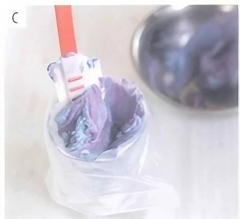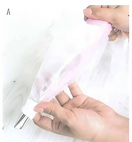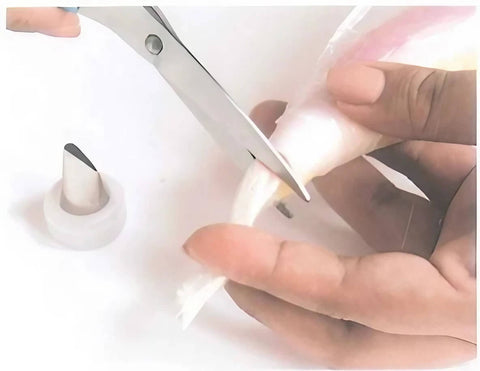 4. Прикрепите муфту к концу кондитерского мешка, позволяя развязанному концу полиэтиленовой пленки выйти из муфты, затем отрежьте лишнюю полиэтиленовую пленку и прикрепите наконечник для труб.