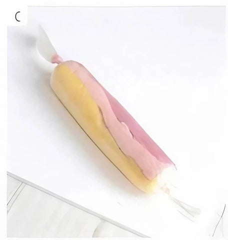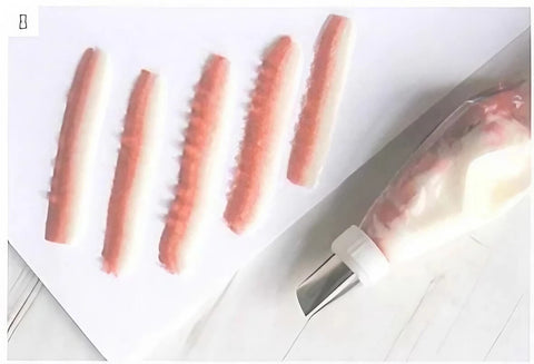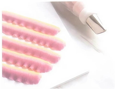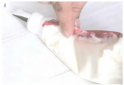 2. Вырежьте отверстие среднего размера на конце каждого кондитерского мешка, затем последовательно нанесите три цвета на полиэтиленовую пленку по желанию.