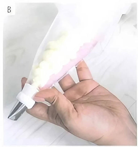 1. Наполните два отдельных кондитерских мешка сливочным кремом разного цвета и вырежьте на концах отверстие среднего размера. Затем, используя третий пакетик с насадкой для окантовки, добавьте вторичный цвет в пакет возле более узкого конца насадки для окантовки (А).