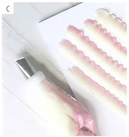 3. Сжимайте кондитерский мешок до достижения желаемого эффекта (С). Вы можете вращать кончик каймы по или против часовой стрелки, чтобы отрегулировать ширину вторичного цвета.